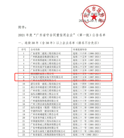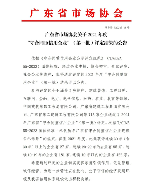 近日,廣東省市場協(xié)會發(fā)布了2021年度“守合同重信用企業(yè)”(第一批)評定結(jié)果,我公司榮耀再續(xù),連續(xù)三十五年“廣東省守合同重信用企業(yè)”稱號。獲得此榮譽,不僅對公司實力的認可,更是對誠信經(jīng)營和優(yōu)質(zhì)服務(wù)的肯定。